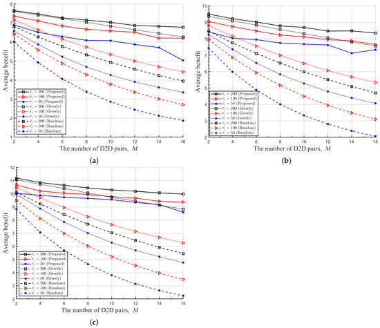 Average benefit of the proposed and other RA schemes with respect to M for various . (a) , (b) , (c) .