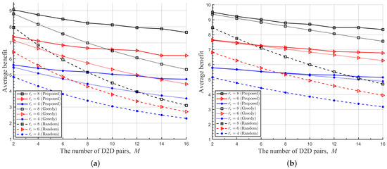 Average benefit of the proposed and other RA schemes with respect to M for various . (a) = 100 [m], (b) = 200 [m].