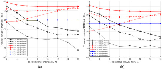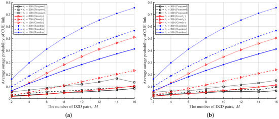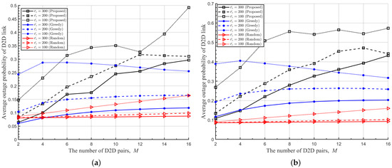 Average outage probability of D2D links with respect to M for various . (a) , (b) .