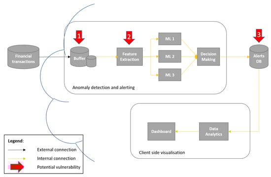 It should be noted that the considered cyberattacks include different malicious activities that aim for the cloud infrastructure of the system. The potential financial frauds are separately considered, namely, in the form of modelled (expected) user behaviour. Figure 1 presents also potentially vulnerable system components in the case of a cyberattack, but this will be discussed in more detail in Section 5.