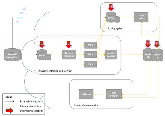 The extended variant of the proposed fraud alerting system, in addition to the module described in the previous subsection, includes a ML-based scoring module as an additional alerting module. This module considers historical user data, and its main purpose is to increase the resilience of the alerting system as a whole. Figure 2 depicts the architecture of the extended fraud alerting system, including the (i) anomaly detection and alerting module, (ii) scoring system module, (iii) database with two instances/services (alerts database and scores database) and (iv) client side visualisation module. (Please note that numbers on the red arrows indicate attack scenarios that are described in more detail in Section 5.2). Similarly to the basic fraud alerting service, Figure 2 depicts also potentially vulnerable system components in the case of a cyberattack (see Section 5).