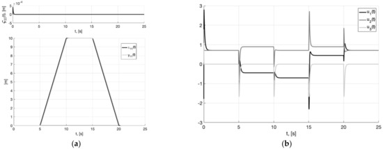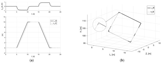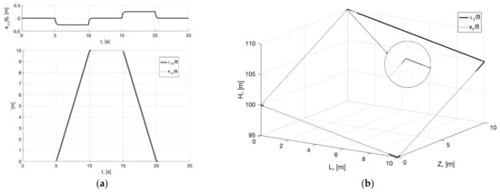 In Figure 1a, we present the plots of the first component of the reference signal (38), its processing of the corresponding output variable of generator (30), and tracking error For the rest of the components of vectors , , , the graphical results are similar. We can see from Figure 2a that m. In Figure 1b, we show the spatial plots of the reference polyline and output variable of generator (30). We see the smoothing of sharp corners at singular points.