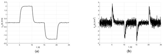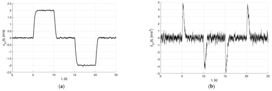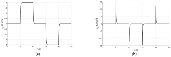 As was mentioned in Section 2, the useful signal elements are assumed to be piecewise-continuous deterministic functions of time with bounded derivatives. The smoothness requirements are not imposed on them, their analytical description is unknown. The constraints are understood as one-sided at the points of finite discontinuity. We assume that the norm of the vector of reference action velocity is less than the design bound on the norm of the UAV velocity vector in the areas of continuity