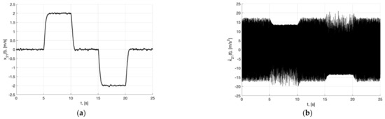 As can be seen from Figure 4, Figure 5, Figure 6, Figure 7, Figure 8 and Figure 9, the first and second hypotheses are confirmed. In the signals (Figure 5a and Figure 8a) and especially in (Figure 4 and Figure 7), the parasitic component is quite small. The effects of corner smoothing, boundness of all variables and controls (Figure 6b and Figure 9b) are preserved. The output signals of closed-loop systems (Figure 6a and Figure 9a) are very similar to the output signals of a closed-loop system with a noisy reference (Figure 3a). In Experiment 1b (Figure 7, Figure 8 and Figure 9) the noisy of signal is less compared to Experiment 1a (Figure 4, Figure 5 and Figure 6). This is achieved by reducing the value of gain factor (41) by 2.6 times. However, we see (Figure 4a and Figure 7a) that the values of tracking errors are increased. In both cases, the signals (Figure 5b and Figure 8b) and (Figure 6b and Figure 9b) very noisy. Since these signals are directly interfered with noise. The following experiments are aimed at improving the filtering of vector signals , . It ensures by additional low-pass filters, with which we will use dynamic generator with parameters (43).
