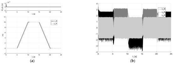We can see from Table 2 that the goal of UAV control was achieved in all experiments: the average value of the error (that show how plant output variable tracks the generator output) is about – m (which is due to the presence of noise and numerical integration errors). The use of low-pass filters in Experiments 2–4 reduces the Std of the control action by 9.9–49.5 times compared to Experiment 1b, where filters are not used. Note that the values of performance indicators for and are comparable to those in Experiments 2 and 4. Therefore, additional filtering of the second derivative of the generator is redundant (Experiment 4). It is sufficient to add only one filter on reference signal (Experiment 2). The results of Experiments 2 and 3 show that the filtering of the reference signal (Experiment 2) makes it possible to reduce the Std of the control by a factor of 5 compared with filtering the second derivative of the generator (Experiment 3). However, the filter on the reference signal distorts the useful component more. This leads to a larger error in Experiment 2 (0.81 m) compared to Experiment 3 (0.58 m). Thus, Experiments 2 and 3 are the most promising for practical implementation. Note that the selection of a specific implementation option depends on the workspace in which the plant operates, the requirements for control smoothness, and the capabilities of computing resources.