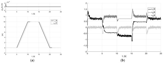 Experiment 1b. In (a), plots of the reference signal (38) and output variable of closed-loop system (42) (shown below) and tracking error (shown above). In (b), plots of the control actions (41).