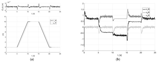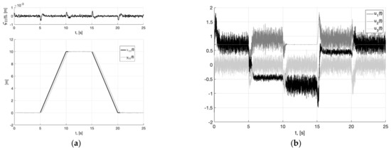Experiment 2. In (a), plots of the reference signal (38) and output variable of closed-loop system (6), (37), (44), (45) (shown below) and tracking error (shown above). In (b), plots of the control actions (37).