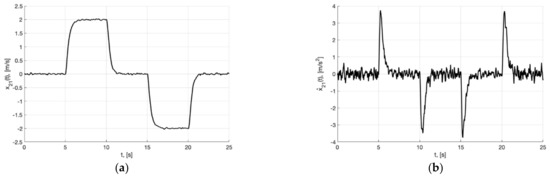 Note that the dynamic generator (30) contains fewer blocks than the standard dynamic differentiator (12). In system (30), the estimated signal of the second derivative of the reference signal is the right side of the second block of the system (30). It is defined by the expression .
