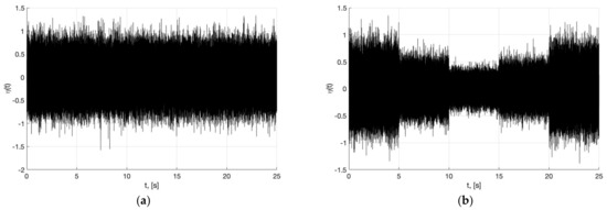 We also conducted an additional Experiment 5 to test the performance of the developed approach under time-varying noise parameters (which is close to the real conditions of the UAV operation). The conditions of Experiment 2 were taken as the basis for simulation. We used generator (45) with only one pre-filter (44) for a noisy signal with the same parameters as in Experiment 2. Here, noise had a normal distribution with a zero mean and time-dependent variance: