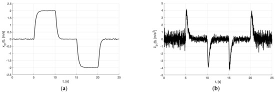 Table 2 shows the values of performance indicators of closed-loop systems and signal processing in Experiments 1b and 2–4. We calculated the sample mean (Mean), corrected sample standard deviation (Std) and the maximum value (Max) of the following: absolute value of error , which describes how the generator variable tracks the reference signal; error , which describes how the plant output variable tracks the generator variable; absolute value of control (for the rest of signals , the values of indicators are similar). For the calculation, we used the values of the samples from the time intervals indicated in Table 2: for and are the first transient response and steady state, for are the second one.