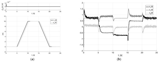 Experiment 4. In (a), plots of the reference signal (38) and output variable of closed-loop system (6), (47), (shown below) and tracking error (shown above). In (b), plots of the control actions (47).