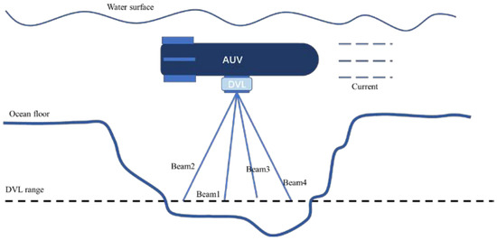 An AUV navigation system is composed of SINS, DVL, and a pressure sensor (PS), as shown in Figure 1. SINS provides required velocity, attitude, and position information through a gyroscope and an accelerometer. DVL has a four-beam Janus structure, and it does not require external information to reduce the error accumulation in SINS. The PS is a device that provides depth information for AUV, and it is usually considered an alternative to DVL. To make full use of the effective information from the sensor, the system adopts a tightly coupled navigation structure.