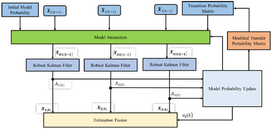 where and are the state estimate and its covariance matrix of filter i at the last epoch, respectively, is the mixing state vector estimate of filter j in the current epoch, and is its corresponding covariance matrix.