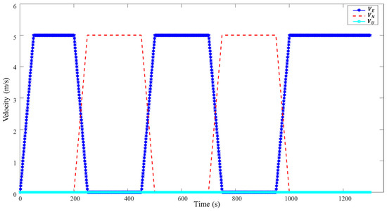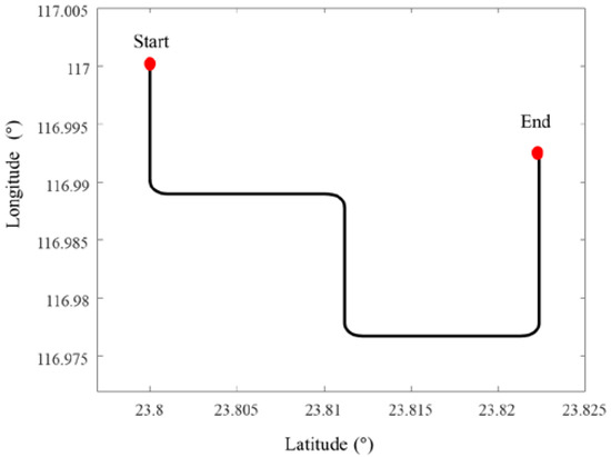 The whole simulation time lasts for 1300 s, which includes acceleration, deceleration, uniform, and turning motion, as shown in Figure 5 and Figure 6. The AUV starts at [] at a depth of 5 m. The sampling frequencies for IMU, DVL, and PS are 200 Hz, 1 Hz, and 1 Hz, respectively. The main performance parameters of IMU, DVL, and PS are listed in Table 1. Because of the different sampling frequencies at each sensor, synchronization of the sensor before data fusion is required. In this paper, the least-squares registration method is used for time synchronization [37].