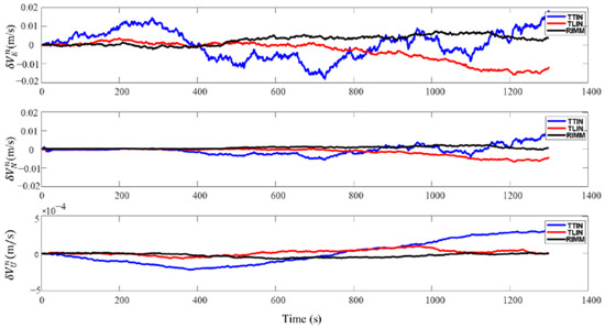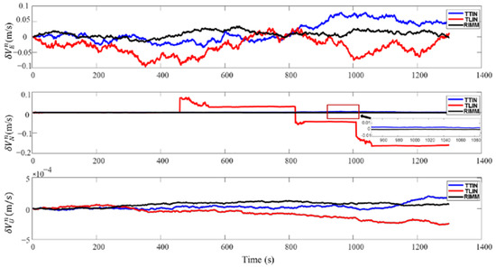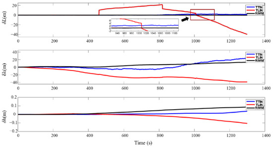 In terms of position error, the PS can provide high-precision depth information during the motion of the AUV. Figure 8 shows that the height position always maintains a stable high precision throughout the navigation process. Table 3 also shows that the maximum height deviation position has a −0.084 m error during the entire simulation process. Furthermore, the velocity error in the also remains stable because of the PS, and the maximum velocity errors of TTIN, TLIN, and RIMM are 0.00030 m/s, 0.00010 m/s, and 0.00007 m/s, respectively. Therefore, when DVL is in a stable working state, the three integrated navigation algorithms show stable navigation and positioning accuracy.