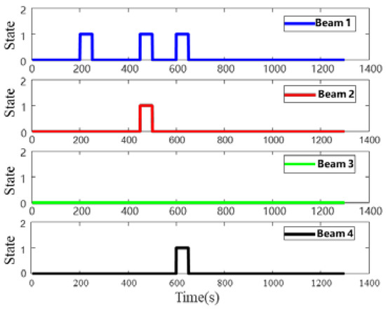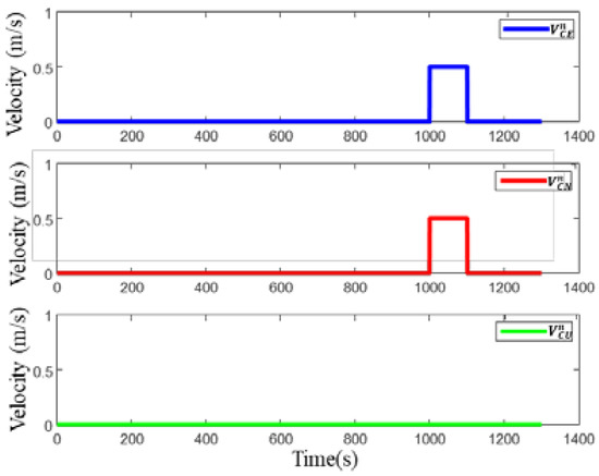 The impact of the external environment on DVL is shown in Figure 9 and Figure 10. The value 1 in Figure 9 indicates that the DVL beam is in an abnormal state, and the value 0 indicates that the DVL beam is in a normal state. In terms of the impact of water flow on DVL, the simulation is conducted on the impact of east flow velocity and north flow velocity, and the flow velocity is 0.5 m/s, as shown in Figure 10. There are four processes to simulate the abnormal situation of DVL shown in Figure 9 and Figure 10. The first phase is based on failure case 1 in DVL bottom-track measurement mode lasting for 50 s. The second phase is based on failure case 2 in DVL bottom-track measurement mode lasting for 50 s. The third phase is failure case 3 in the bottom-track measurement mode lasting for 50 s, and the fourth phase is the normal state, where the water flow affects the working status of DVL, lasting for 100 s.