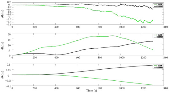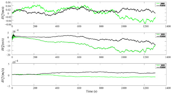 Here, the traditional IMM algorithm is compared with the proposed RIMM algorithm. The DVL working environment in the simulation is consistent with that in Section 4.2. Through simulation, AUV velocity and position changes under the RIMM algorithm and the traditional IMM algorithm are shown in Figure 13 and Figure 14, where the results of the RIMM algorithm are shown by a black line, and the results of the IMM algorithm are shown by a green line. In the simulation process, due to the role of PS, the velocity and height in the up-change amplitude of the two algorithms are small. Therefore, this section mainly compares the differences between the two algorithms in plane velocity and position error optimization.