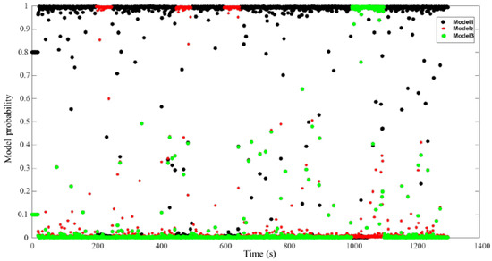 Figure 15 and Figure 16 show the process of model probability change for the RIMM and IMM algorithms, which are the key factors determining filter precision. Model 1 shown by black points indicates that there is no external interference in the filtering process for DVL. Model 2 shown by red points indicates that DVL is filtered by the bottom-track measurement mode. Furthermore, Model 3 depicted by green points indicates that DVL is filtered by considering the influence of water flow. Figure 15 shows that the traditional IMM algorithm uses a fixed Markov transfer probability. When external noise is generated, the IMM algorithm cannot convert the probability quickly. This is the reason for the reduced navigation accuracy of the IMM algorithm.
