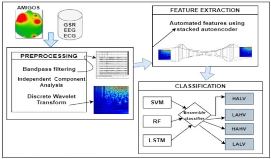 We propose a method for the classification of physiological signals that classify emotions into four classes, i.e., HVHA, LVLA, HVLA, and LVHA. The flow diagram of proposed system is shown in Figure 2. The proposed system mainly consists of three steps: preprocessing, feature extraction, and classification. After performing different experiments with varying window sizes an overlapping window of 30 s with an overlap of 15 s has been selected to segment data into equal-sized segments. In preprocessing first bandpass filters are applied on physiological signals to remove power lines and baseline noise. After noise removal, ICA (independent component analysis) was applied to EEG signals followed by the discrete wavelet transform (DWT). In features extraction, stacked autoencoder is used to extract machine-learned features from the preprocessed signals and then SVM and LSTM were used to classify the emotions into four categories. Three main phases of the paper are discussed below: