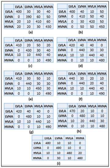 Table 1 shows the results obtained with different experiments. First of all, the system was assessed without performing preprocessing and CNN was used to classify emotions into four classes, i.e., LAHV, HALV, HAHV, and LALV. In this experiment, with no preprocessing, an accuracy of 81.5% was observed with an average specificity of 91%. In the second experiment system, preprocessing was performed using a bandpass filter. It has been observed that the system’s accuracy has been improved by doing preprocessing and it is equal to 84%. Therefore, it is important to remove signals baseline and other types of noise for emotion recognition. In the third experiment, preprocessing is further enhanced by using Independent component analysis (ICA) which removes powerlines, etc., and improves the system’s overall performance.