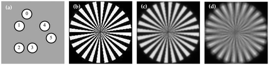 Like the previous studies [9,10], we also used simulated data to validate our method. First, we built the Golay-6 OSA system, as shown in Figure 1. The diameter of the surrounding circle approximated 24.17 mm, and the diameter of the sub-aperture was 5 mm, with a filling factor roughly equal to 25.68%. The system’s focal length was 1000 mm.