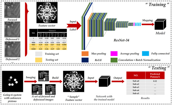 The whole process is shown in Figure 3, including training and testing procedures, where Sub-a0 represents the sub-aperture 0. In training, we used DSMs as the feature vectors for the inputs, and the corresponding pistons as labels were also input as the ground truth, while using the Power Metrics (PM) and the Sharpness Metrics (SM) as a contrast to explore the detection precision and accuracy. We used two defocused images and one focused image to build the DSM. The defocused images had the same defocus distance but opposite directions.