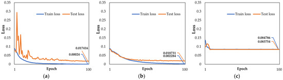 The evolution of the loss function during training for the Golay-6 OSA system based on Power Metric: (a) ResNet-34; (b) Alex Net; (c) VGG-16.