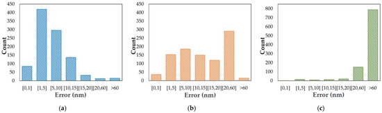 The scatter diagram of the corresponding testing results of sub-aperture 5 is displayed in Figure 6a–c. We can see that both the DSM and the SM samples converged well within a specific range, and that the DSM’s error was more centrally distributed. With few errors ignored, the two Sharpness Metric splash ranges were more concentrated than the PM: this shows that the DSM has higher precision.