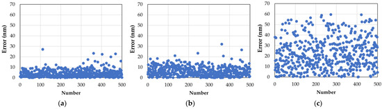 The testing results of the different data sets: (a) 500 errors were selected from the testing data set based on the DSM; (b) 500 errors were selected from the testing data set based on the SM; (c) 500 errors were selected from the testing data set based on the PM.