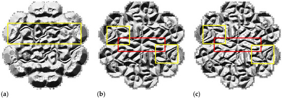 The contrast between Uniform Pattern LBP feature extraction based on the PM, the SM, and the DSM loaded with the same pistons: (a) the LBP feature of the PM; (b) the LBP feature of the SM; (c) the LBP feature of the DSM.