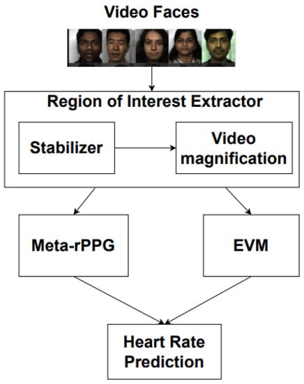 Heart rate is a vital body signal that enables the monitoring of a person’s health. In addition to conventional techniques of measurement, visual estimation typically employs a camera or a low-cost, minimally invasive device [9]. In recent years, research on heart rate estimation by video has increased [10,11], while PhotoPlethysmoGraphy (PPG), a technique for measuring variations in blood volume on a variety of devices to estimate heart rate [12] has gained popularity.