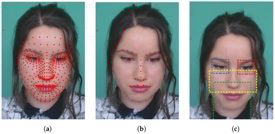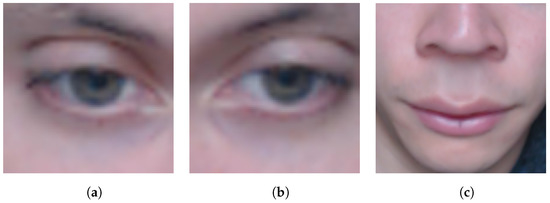 Exemplification of the frames of the ROIs. (a) ROI image of the right eye. (b) ROI image of the left eye. (c) Image of the lower face ROI.