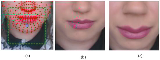 Exemplification of the construction of ROIs. (a) Example of the center point of an ROI. (b) Example of the ROI cutout of the mouth without distortion. (c) Example of an ROI cutout of a mouth with distortion.