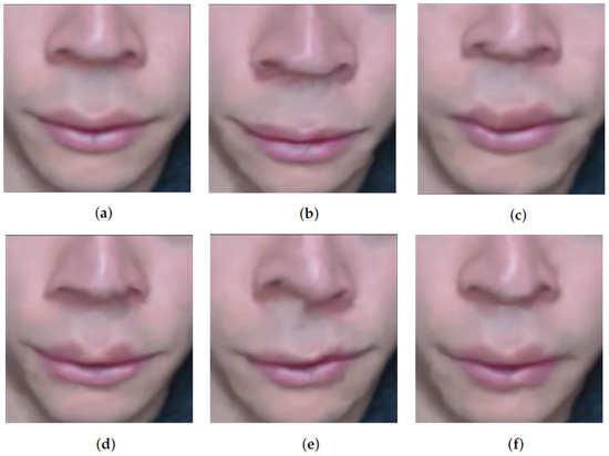 Bottom face frames after applying the video magnification technique. (a–f) sequence of frames with video magnification technique applied.