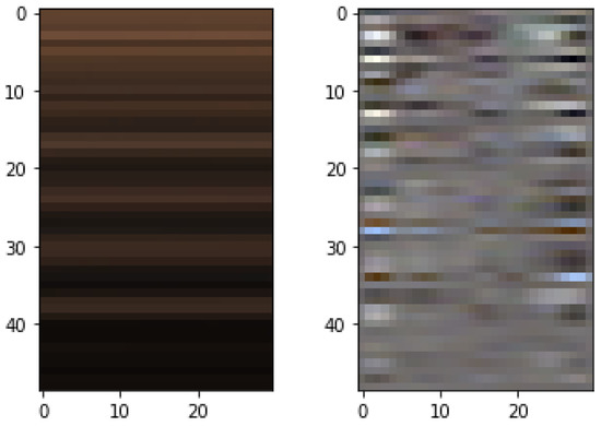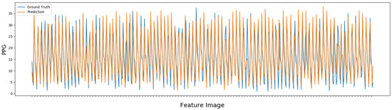 The resulting images were resized to a ribbon and can be seen in Figure 6. Furthermore, other modifications made to the network allowed for improved results, among them, the addition of EVM scalability, allowing the model to be trained with a larger amount of data, increasing its performance. These modifications provided an improvement in the network’s prediction responses. Furthermore, after adapting the target for PPG, the network improved significantly, resulting in a higher , as presented in Table 3 were the bold numbers are the best results overall.