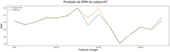 The graph of the BPM and PPG prediction of one of the individuals present in the dataset UBFC-rPPG of the third test, which obtained the best results among those tested through the scalable Meta-rPPG technique, can be seen in Figure 8 and Figure 9.