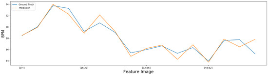 In order to improve computational performance and reduce the occurrence of overfitting in the model training, input data resolution reductions were performed throughout the network. Thus, a dropout layer was used at the end of the net to reduce overfitting and improve generalization ability. The output consists of only one neuron, since heart rate is only one label, since the model’s input feature image contains one second of information. Furthermore, all labels were normalized in the range of zero and one before the training step was started. The smallest of the beat range, 45 BPM, goes to the value zero, and the largest of the range, 240 BPM, goes to the value one. For the loss function, the Euclidean distance calculation was applied to calculate the difference between the values predicted by the model and the true absolute values.
