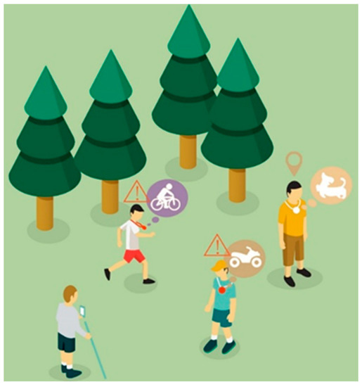The design scheme also considers the social difficulties visually impaired children face, providing them with a way to invite friends or relatives to participate in their own training, as shown in Figure 3. Visually impaired children may experience a moving sound source by wearing amulet sound source accessories, as can their friends or relatives who join the training. For example, if visually impaired children choose to cross the road, they can simulate walking around passing vehicles. Then, the AR orientation training application tracks the amulet sound source accessories, which can describe the relevant road conditions and give relevant task instructions so that the visually impaired children can better complete the orientation training. This not only improves training efficiency, but also enhances the attraction of event participation.