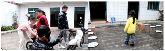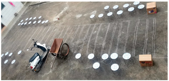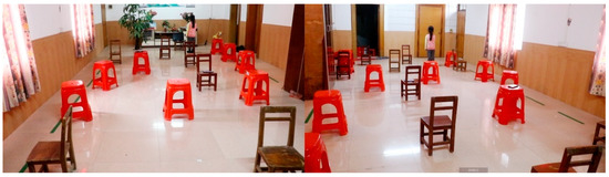 After our first experiment, to further verify the effectiveness of the orientation training, we conducted an inter-group comparison experiment. Two groups performed the comparative experiment. One group of children used the prototype intervention training of the orientation training aid, and the other group did not receive the aid. The test site of the verification experiment was an outdoor area of 8 m × 3 m. We built a simulated road scene in this area and prepared a tram and a cart. To better simulate the actual road conditions, the author placed several stools on the side of the road to act as vehicles and obstacles on the road. The specific arrangement is shown in Figure 8 and Figure 9.