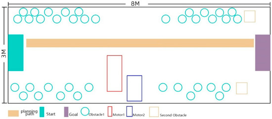We used comparative experiments to verify the effect of the training. The first experiment in this study involved an 8 × 4 m2 experimental scene in an indoor environment. In the experimental site, more than 20 obstacles of unequal volumes were placed. These included tables, chairs, and daily household necessities to simulate reality and enrich the experimental system. Figure 5 shows the specific experimental scene.