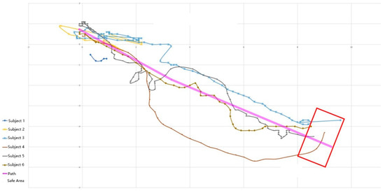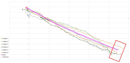 In this experiment, participants in the intervention group reached the finish line during the green light. The authors screened the refined relevant experimental data and sorted the suitable and effective mobile data into the path graph shown in Figure 11. In the figure, purple represents the planned path, the red box represents the end range, and other colors represent the movement paths of six subjects in the intervention group. All blindfolded participants could move from the starting point to the endpoint, and some encountered roadside obstacles. The subjects were informed that they had suddenly lost their direction in the middle of the test and had finally found their original direction after coming in contact with obstacles.