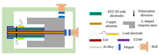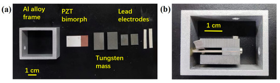 The tunable PVEHs designed in this paper are composed of piezoelectric bimorph, L-shaped tungsten mass and aluminum alloy frame, as shown in Figure 1. The piezoelectric bimorph is composed of two PZT-5H sheets and the copper substrate layer in the middle by E44 epoxy resin bonding. PZT-5H sheets are covered with Ag electrodes and form series connection with opposite polarization direction. The L-shaped tungsten mass is used to ensure high power density. Aluminum alloy frame is fabricated by 3D printing. Assembly processes use E1309 AB glue bonding in mass, bimorph and frame clamping. The M5 bolt bonding with NdFeB magnet inserts into the frame to adjust the resonant frequency.