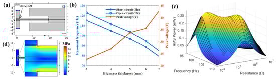 PVEH modeling and simulation: (a) PVEH 2D model; (b) PVEH resonant frequency and peak voltage varied with big mass thickness; (c) RMS power in different load resistance near resonant frequency of PVEH with 5 mm big mass thickness; (d) stress check cloud chart.
