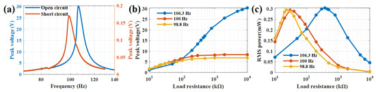PVEH frequency modulation result by load impedance: (a) PVEH experimental peak voltage frequency response curves at open circuit (load resistance of 10 MΩ) and short circuit (load resistance of 1 kΩ); PVEH experimental (b) peak voltage and (c) RMS power in different load resistance at 106.3 Hz, 100 Hz and 98.8 Hz, respectively.