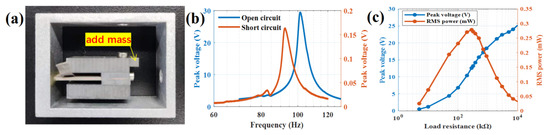 PVEH frequency modulation result by adding mass: (a) PVEH prototype with added mass; (b) PVEH experimental peak voltage frequency response curves at open-circuit (load resistance of 10 MΩ) and short-circuit (load resistance of 1 kΩ); (c) PVEH experimental RMS power in different load resistance at 100 Hz.