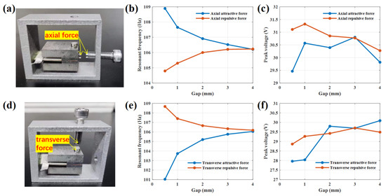 PVEH frequency modulation method and result by magnetic force: (a) PVEH prototype with axial magnetic force; (b) Resonant frequency and (c) voltage at open-circuit (load resistance of 10 MΩ) by axial attractive force and repulsive force with a different magnetic gap; (d) PVEH prototype with transverse magnetic force; (e) Resonant frequency and (f) voltage at open circuit (load resistance of 10 MΩ) by transverse attractive force and repulsive force with different magnetic gap.