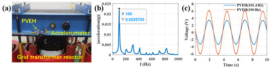 To verify the actual effect of the PVEH, the 100 Hz PVEH and accelerometer are mounted on the tank of a grid transformer reactor (400 V 100 kVA), as shown in Figure 7. Acceleration spectrum (through Fourier transform) shows the main resonant frequency and amplitude are 100 Hz and 0.0226 g, respectively. Our PVEH with added mass has open circuit resonant frequency of 101.4 Hz. If we do not adjust the PVEH resonant frequency, the PVEH open-circuit voltage in 100 Hz is 3.6 V. When we adjust the PVEH resonant frequency to 100 Hz by magnetic frequency modulation, the open-circuit voltage is 6.1 V. Therefore, employing our tunable PVEH can handle the resonant frequency mismatch and obtain more efficient energy harvesting.