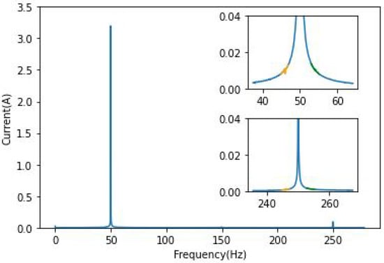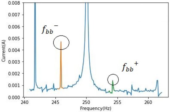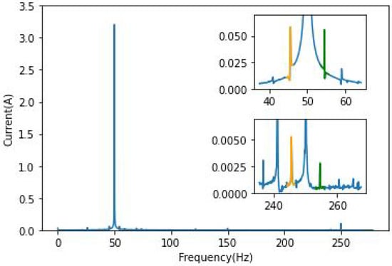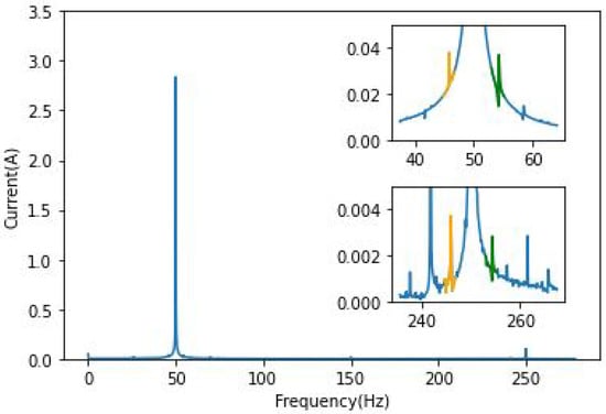 where s is the slip, v = 1, 2, 3, … and k = 1, 2, 3, …. As mentioned in [24], it can be quite hard to identify faulty rotors in the case of a light load because the slip is rather small, and the fault frequency is not only close to the fundamental component but is of a relatively small amplitude. In each of the following figures, as viewed in Figure 1, the , in orange, and , in green, represent both fault frequencies around fundamental and harmonic frequencies.