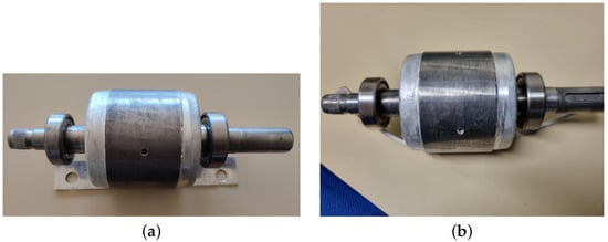 The dataset is split into three health classes: “Healthy”, “one broken rotor bar (1BRB)” and “two broken rotor bars (2 BRB)”, as shown in Table 3. A broken bar is considered as a hole in the rotor (Figure 9a). For the two broken bars class, two holes were drilled in 0 and 6 o’clock positions (Figure 9b). As shown in Table 4, for each class, three different loads were applied, resulting in three speed ranges that differ from class to class, 1432–1439 rpm for high load, 1458–1468 rpm for medium load and 1490–1492 rpm for low load.