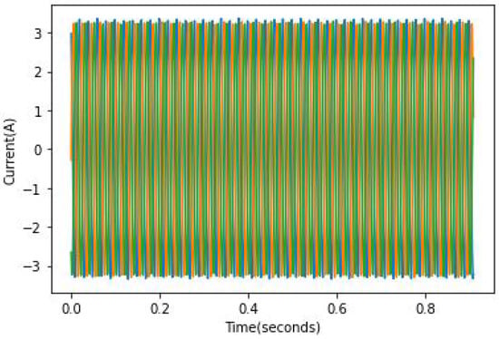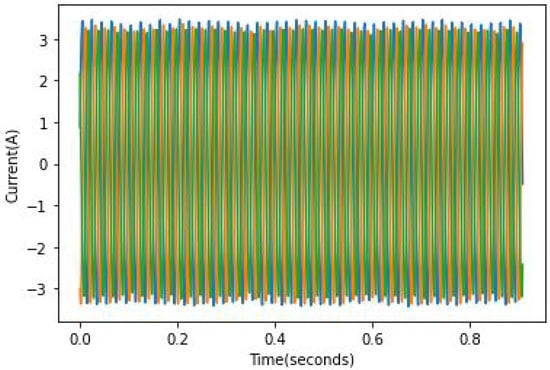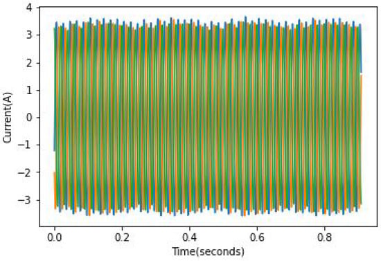 The speed and load were constant throughout all experiments. A variation in speed and load from one experiment to another allows the testing of the model’s robustness because the fault effect is proportional to the load, which means the lower the load, the harder it is to spot the fault. As mentioned in [24], it can be quite hard to identify faulty rotors in the case of a light load because the slip is rather small and the fault frequency is not only close to the fundamental component but is of relatively small amplitude. An example of full load current records can be found in Figure 10, Figure 11 and Figure 12. In these figures, the broken bar influence can be seen on the current envelope.